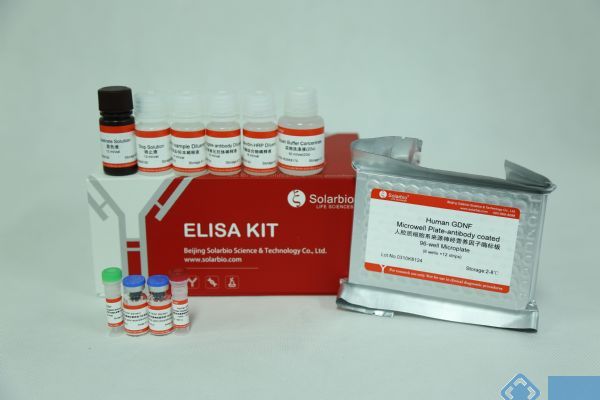 Solarbio ELISA 试剂盒采用基于双抗体夹心法的酶联免疫吸附检测技术。将抗人 GDNF 单 克隆抗体包被在酶标板上;分别加入梯度稀释的标准品和预稀释的样本,标准品和样本中的人 GDNF 会与 酶标板上的包被抗体充分结合;洗板后加入生物素化抗人 GDNF 抗体,该抗体会与板子上包被抗体捕获的 标准品和样本中的人 GDNF 发生特异性结合;洗板后加入辣根过氧化物酶(HRP)标记的链霉亲和素,生 物素与链霉亲和素会发生高强度的非共价结合;洗板后加入显色剂底物 TMB,若反应孔中样品存在不同浓 度的人 GDNF,则 HRP 会使无色 TMB 变成不同深浅(正相关)的蓝色物质,加入终止液后反应孔会变成 黄色;最后,在λmax=450 nm(OD=450 nm)处测定反应孔样品吸光度(OD),样本中的人 GDNF 浓度与 OD 成正比,通过绘制标准曲线和四参数拟合软件便可计算出样本中人 GDNF 的浓度。